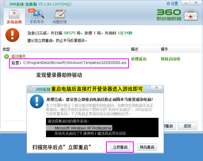 7、查到劫持木马,清除它,并重启电脑